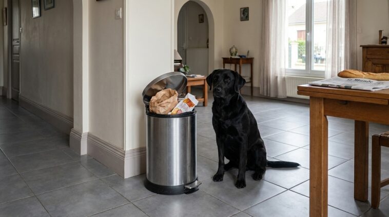 La mesure la plus simple : empêchez votre chien d’accéder à la poubelle en sécurisant celle-ci. Munissez-vous d’une poubelle à pédale robuste ou d’un modèle avec un loquet impossible à manipuler pour votre compagnon. Si votre chien est particulièrement ingénieux ou de grande taille, limitez l’accès aux déchets en plaçant la poubelle dans un placard fermé, sous l’évier ou dans une pièce à laquelle il n’a pas accès en votre absence, comme le cellier ou la buanderie. En supprimant la tentation, vous coupez le problème à la racine, sans recourir aux punitions.